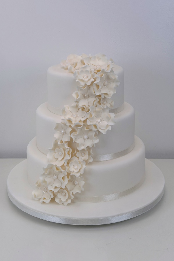 Wedding Cake with Green Silk Ribbon and White Roses No.W455